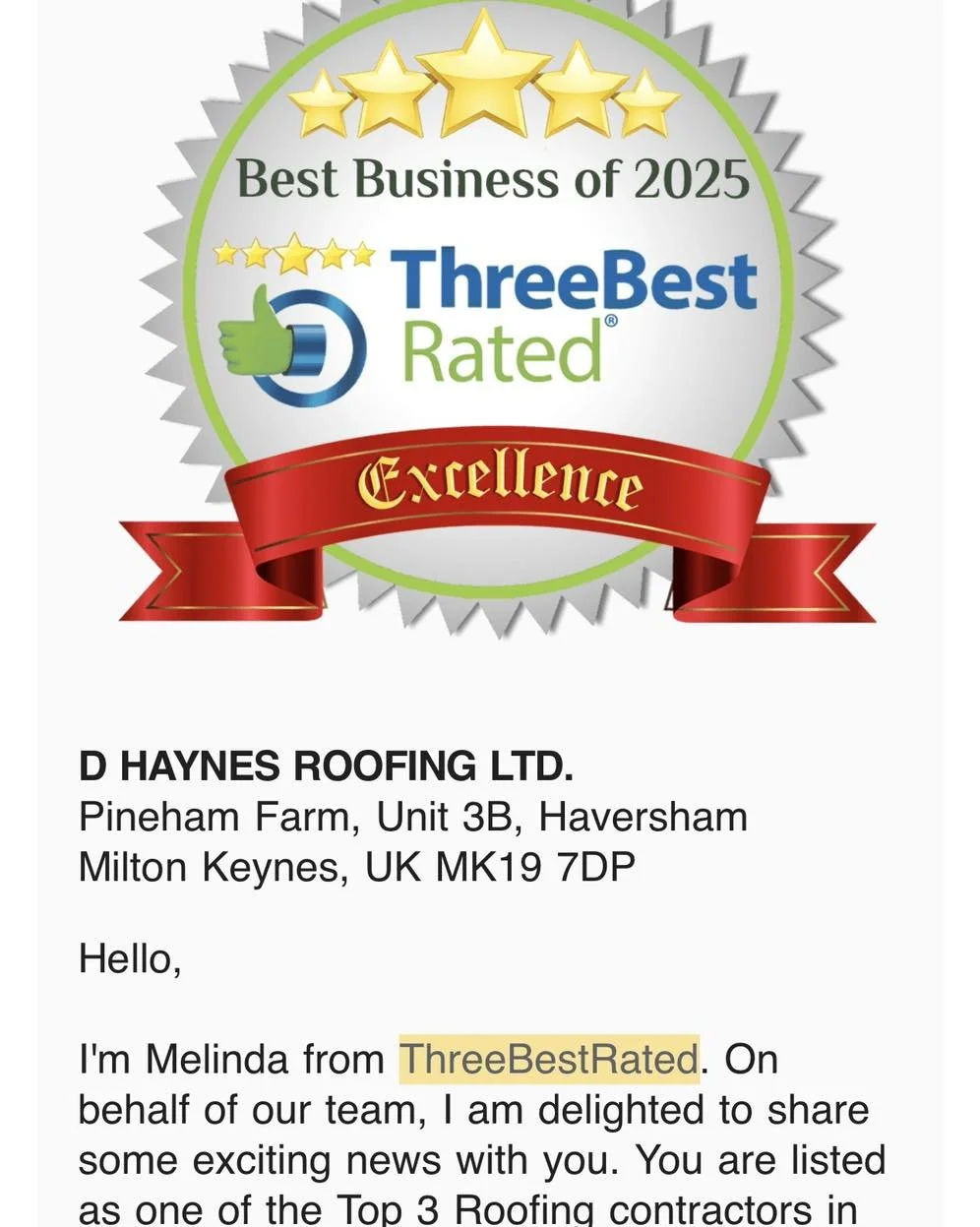 What a fantastic way to wrap up the week here at D. Haynes Roofing! We’re thrilled — and honestly, a little overwhelmed — to announce that we’ve been named Milton Keynes’ Top Rated Roofing Company by ThreeBestRated.co.uk… for the 6th year in a row! 🎉
